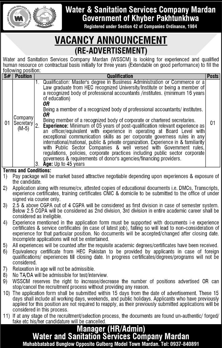 Water and Sanitation Services Company Mardan (WSSCM) is looking for experienced and qualified human resource on contractual basis initially for three years (Extendable on good performance) to fill the following position
